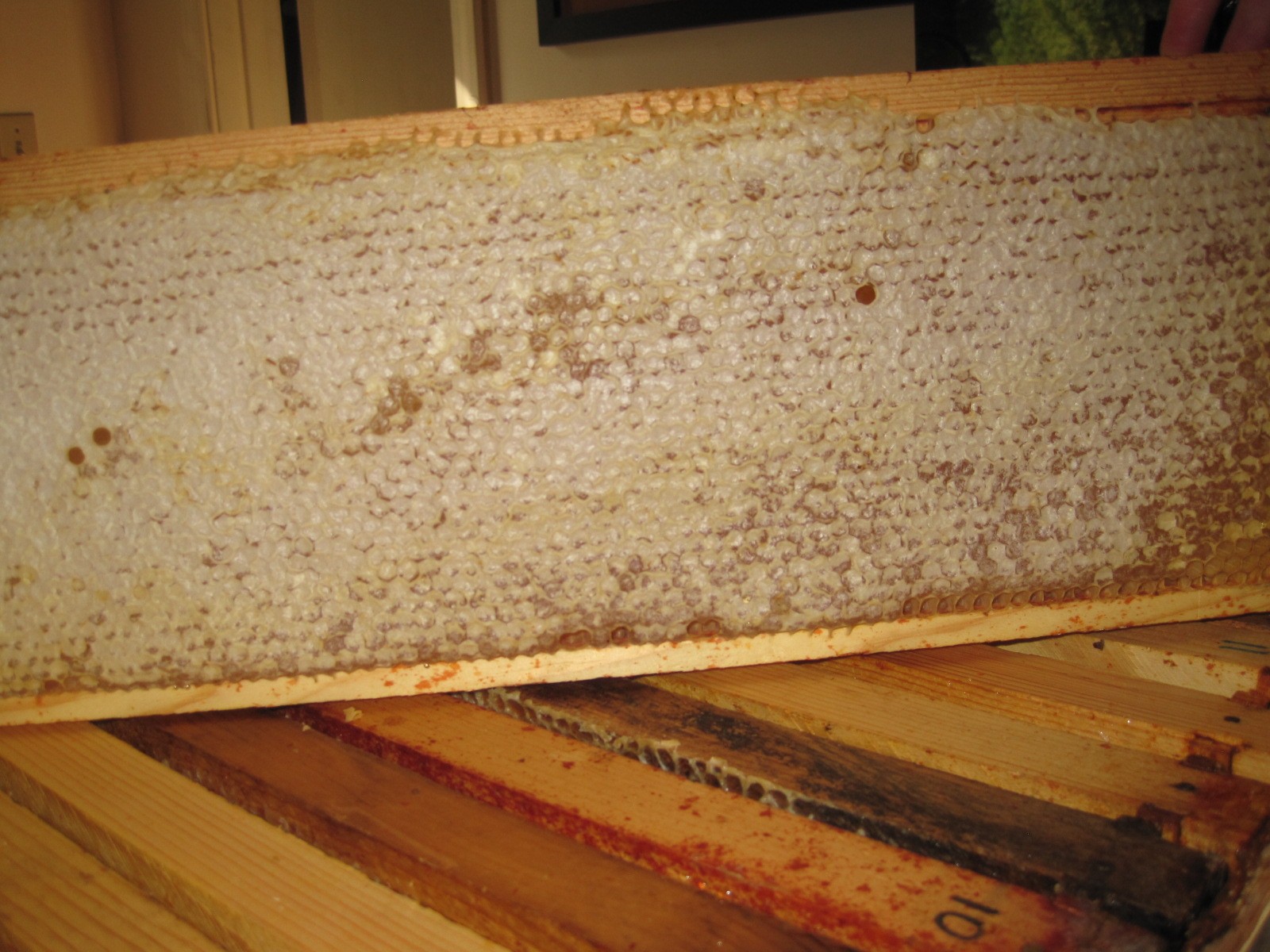 At last, all the honey is off my hives and extracted! While I am incredibly grateful to my bees for the surplus honey they allow me to steal, I must confess that extraction is not my favorite part of beekeeping. The capped honey came off at a higher moisture content than the spring harvest–18% compared to 16% earlier in the season, and just a little higher than the National Honey Board’s recommendation of 17.1%. A bit of hunting around the internet revealed a wide range of moisture levels reported in capped honey. Bee Source has an interesting explanation of honey composition, and the related threads make for even more fascinating reading. (A note for the curious: the USDA Honey Standards can be found on the Oregon Master Beekeeper site as the government shut down prevents viewing the official version.) Because of honey’s hygroscopic nature–it can lose or absorb moisture even through the wax capping–and differences in floral sources and local relative humidity, capped honey can have a moisture content range from 15% to 25%. It seems I may have a little drying to do…