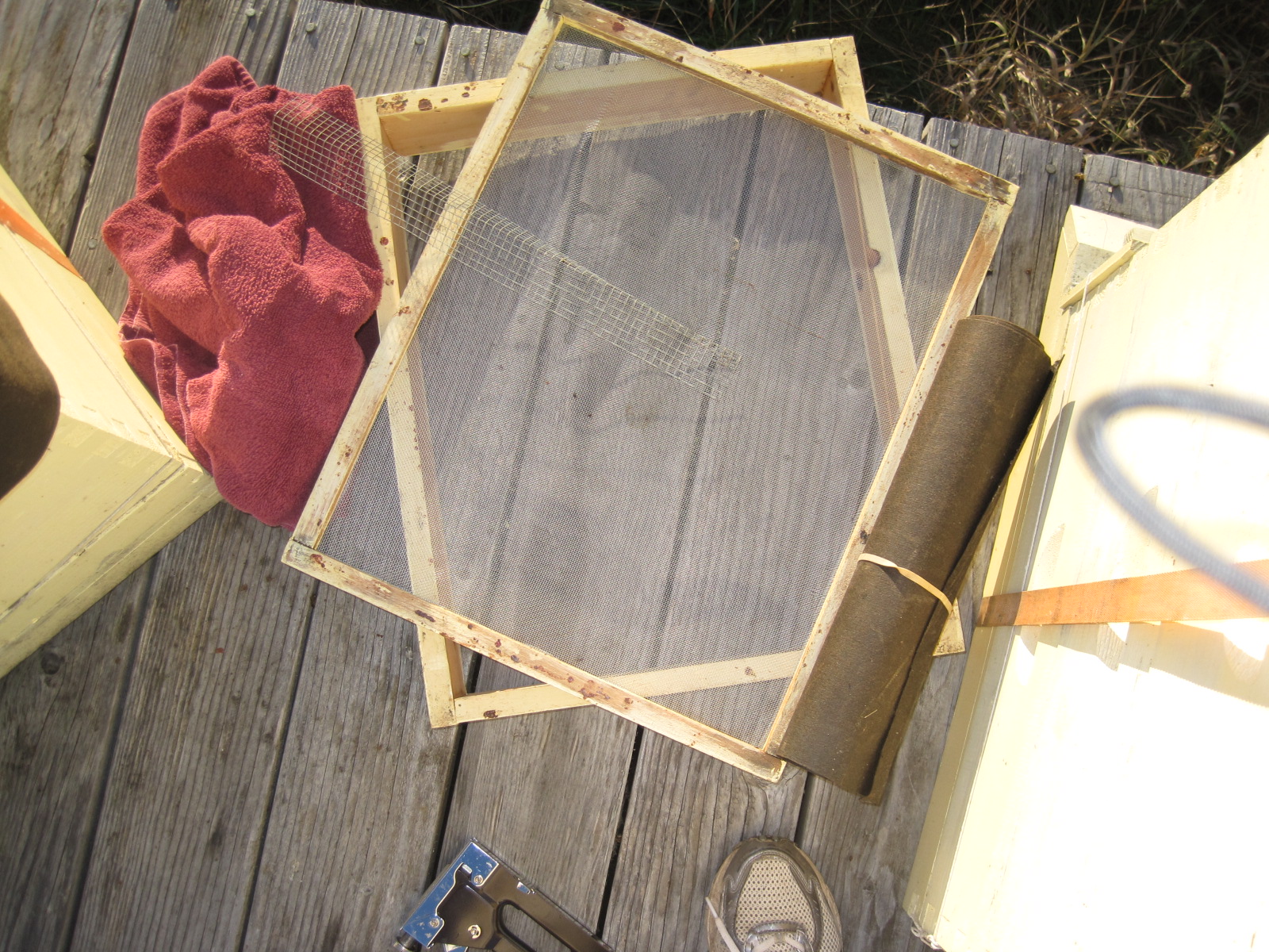 Two weeks overdue, but done at last–my hives are ready for winter. As the weather gets cold, condensation inside the hive becomes a serious threat to colony health. When the respiration of 15,000 bees hits a 20 degree (F) lid, it condenses and drips back into the cluster, wreaking all sorts of havoc on bees and brood. To combat this, many beekeepers install some sort of insulation or absorptive layer between the hive’s inner and outer covers. My personal version includes a screen, a 3 1/2″ tall box and a bath towel. Many folks like to use a ventilated box; my setup requires a towel change every week or two. I prefer this as it gives me an opportunity to check on the bees (heat and hum coming out of the hole in the inner cover means they’re still alive, hurrah); it also gives me my bee fix during a time when a “just curious” peek could prove harmful to the bees.