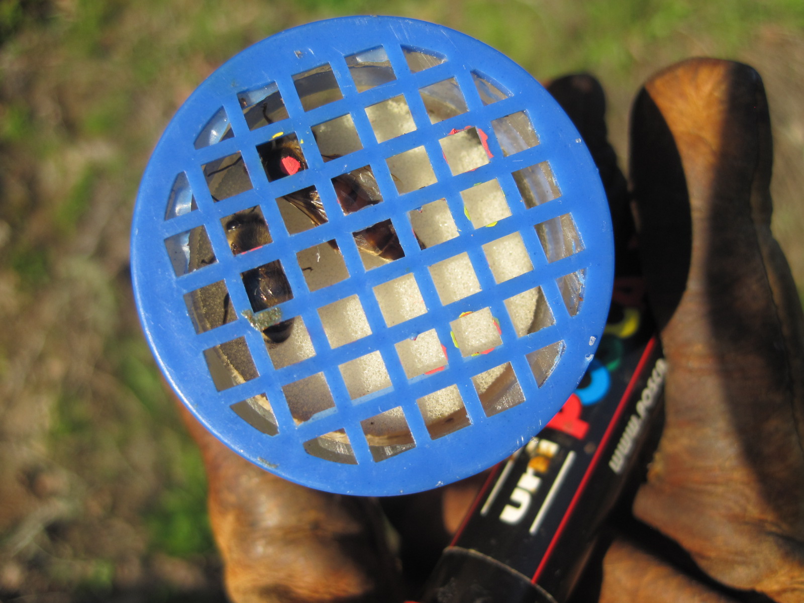 This beautiful weather found me making (only slightly) panicked inspections of my hives after work in the evenings, two at a time. Reports of a swarm a few miles away gave extra urgency to my already-planned visits. While I did not see any swarm cells this week, I took the opportunity to mark the queens I found. This will help me when the swarming/splitting season does get under way here. I mark queens more to know their age than to help locate them in the hive–useful information when making splits or trying to figure out where that surprise swarm originated from. Unfortunately, a few of these queens were marked last fall and had lost their paint dots. I am currently using the UniPosca pens sold by many beekeeping suppliers. I’ve been mostly very happy with them; they are non-toxic, easy to use. Has anyone had particularly good (or bad) luck with a marking system? If so, I would love to hear from you!