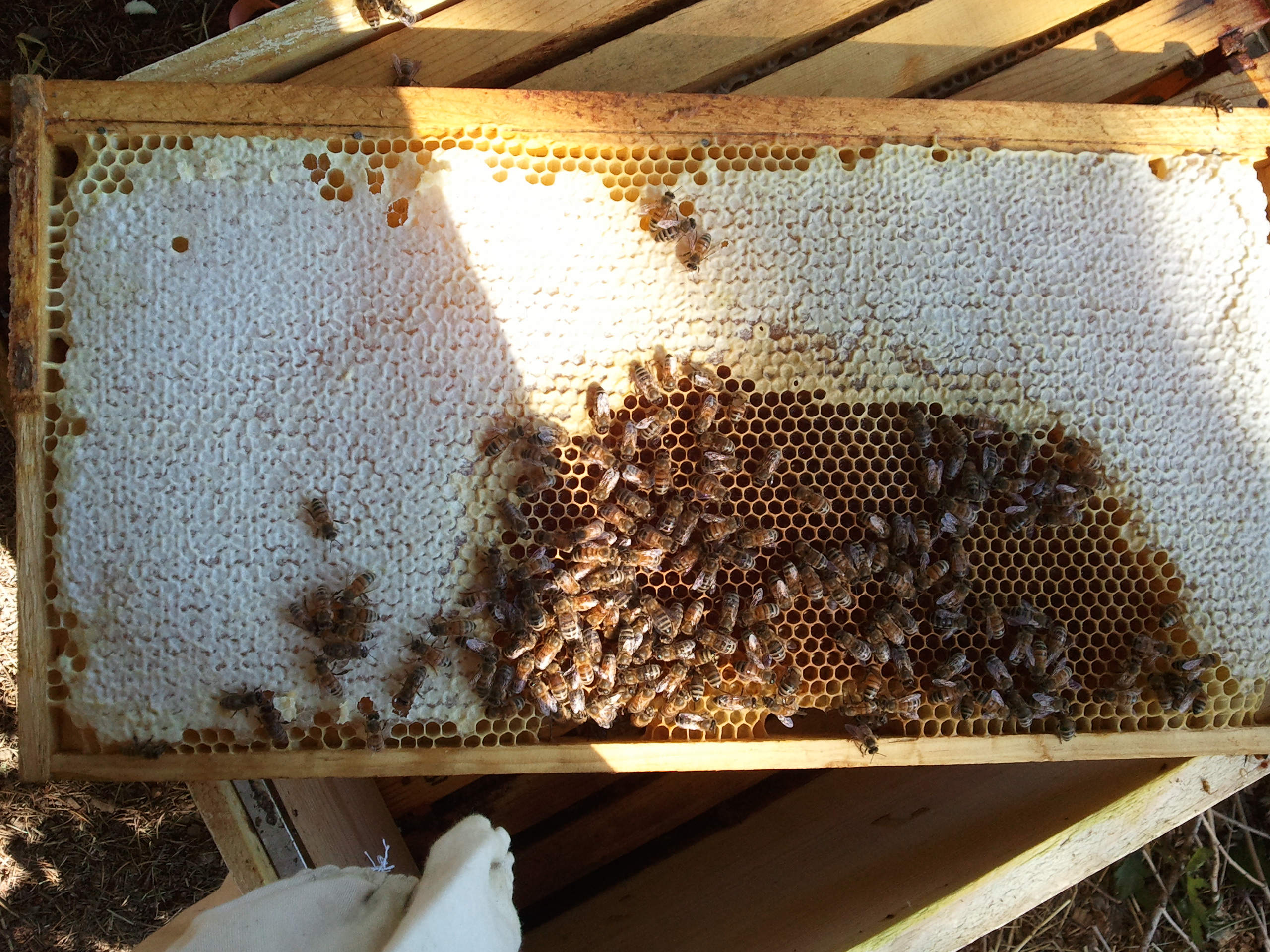 A happy day in the bee yard last week. The good weather allowed me to keep chipping away at my end-of-season inspections. I like to make sure that hives are queen right, adequately provisioned, and well-organized before the fall rains prevent me from opening them. While hive checks this time of year need to be short to forestall robbing, I couldn’t resist taking a quick photo of this 2-deep 2013 colony. The dark cells in this frame are former brood cells now filling with curing honey. With any luck, the bees will have back-filled much of their brood area, giving them plenty of stores for winter and early spring. I usually overwinter hives in one deep and a western, but this colony was so populous that I had a hard time squeezing it all into that configuration. Good job, bees!