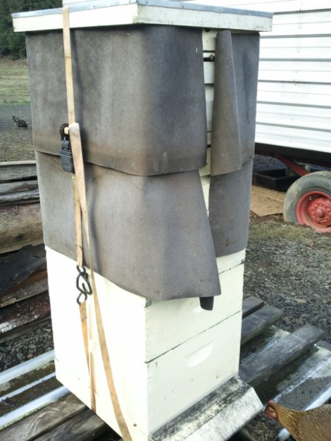 Tar paper pulled back to show equipment. From bottom to top: screened bottom board with mouse guard; full-sized colony in deep and two westerns; double screened shim and inner cover; single western colony; modified inner cover with entrance, supplemental dry sugar and double screened shim above; second single western colony; modified inner cover with entrance; ventilation box with candy board; telescoping top.